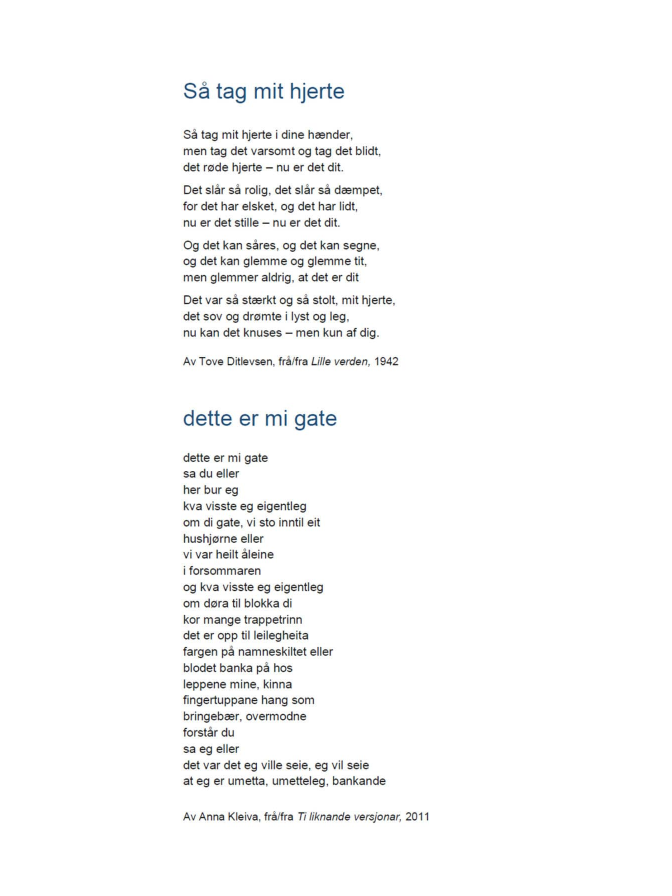 I denne liveøkten ser vi på et dikt som kom på eksamen for noen år siden. Vi konsentrerer oss hovedsakelig om Tove Ditlevsen sitt dikt “Så tag mit hjerte” (1942), selv om jeg muligens kommer til å kommentere det andre diktet også – som er skrevet uten fast rim og rytme.